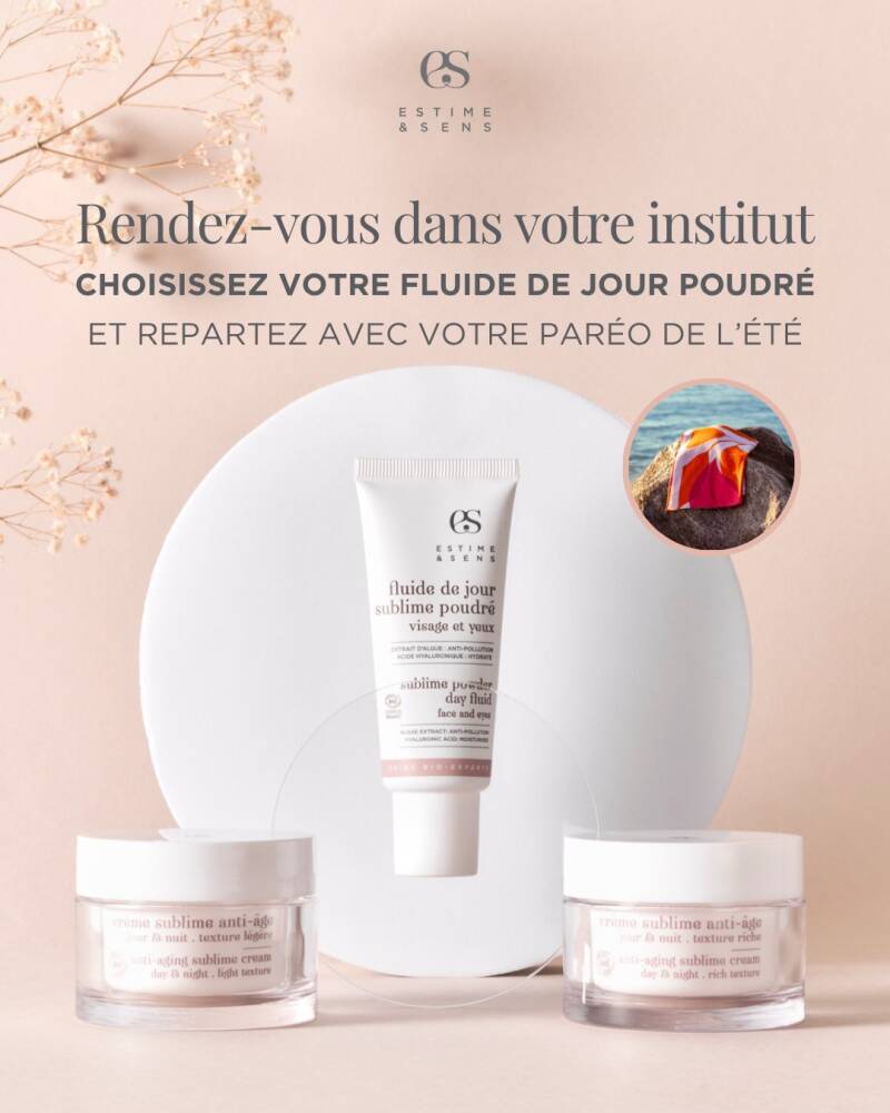 Les fluides poudrés Estime & Sens sont mis en avant ! Cet été pour 39€ d'achat dont un fluide poudré vous repartez avec un paréo aux couleurs de l'été OFFERT !